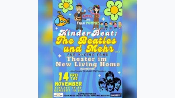 Am 14. November 2025 verwandeln Apfel & Frau Pommes das Theater im New Living Home Hamburg in einen bunten, fröhlichen und schönen Konzertsaal für kleine und große Beatles-Fans! Freut euch auf eine interaktive Show zum Mitsingen, Tanzen, Staunen und vieles mehr, mit Klassikern The Beatles und weiteren Lieblingsliedern, die die Kinder und Eltern gemeinsam erleben können und viele schon kennen.